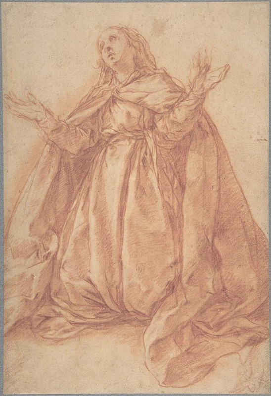 The exact date of the creation of "Kneeling Female Figure with Upraised Arms" is not specified, but it is consistent with Bloemaert's mature style, which combines elements of Mannerism with the emerging Baroque sensibilities. The drawing is characterized by its fluid lines, careful attention to detail, and the effective use of chiaroscuro to create a sense of volume and depth.