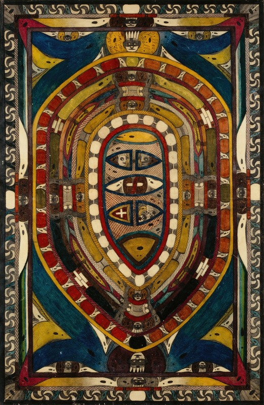 Adolf Wölfli (1864-1930) was a Swiss artist known for his intricate and highly detailed works, often created during his time in psychiatric institutions. One of his notable pieces is "Noga=Ei; Ist Das allergrößte Dorf der gantzen Erde; Villerville," which translates to "Noga=Ei; Is the Largest Village on Earth; Villerville." This artwork is part of Wölfli's extensive oeuvre, which he produced while confined at the Waldau Clinic in Bern, Switzerland.