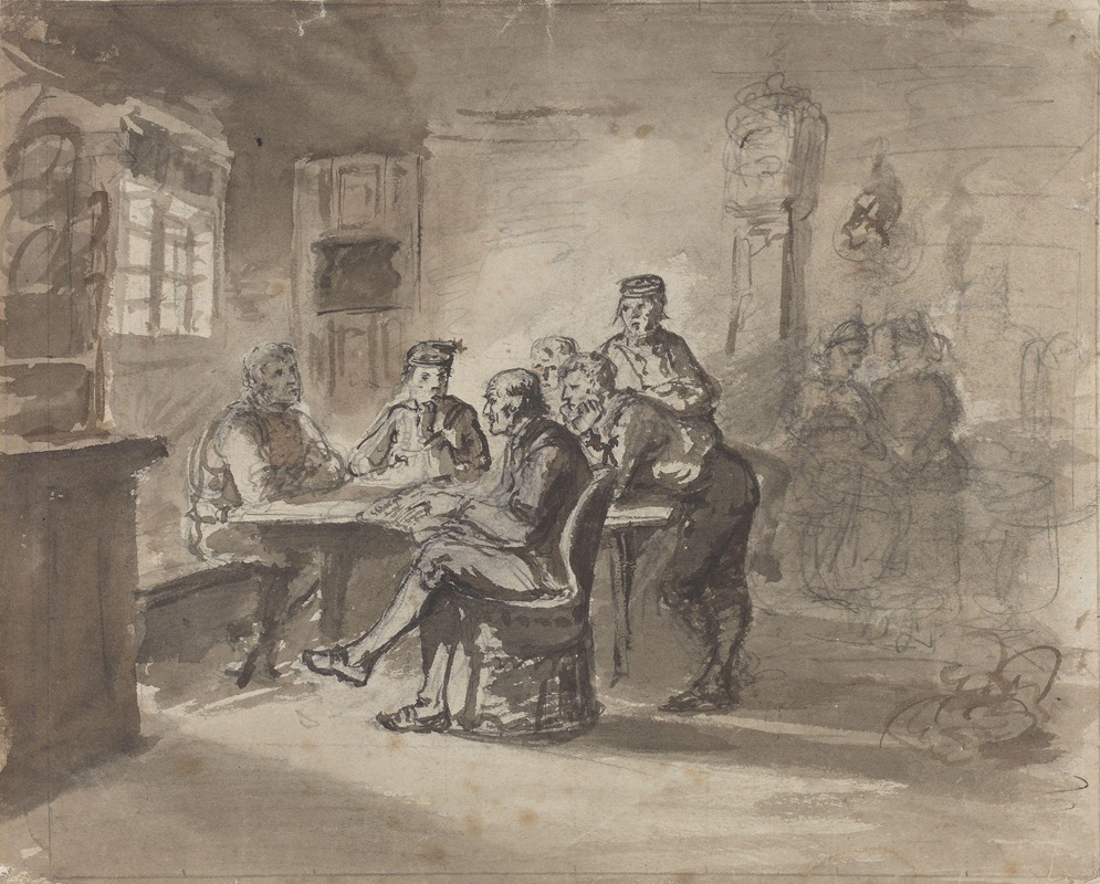 Tidemand's meticulous attention to detail is evident in the depiction of the interior space and the characters' clothing. The artist's use of light and shadow adds depth to the scene, creating a warm and inviting atmosphere. The expressions and postures of the men suggest a lively and engaging conversation, highlighting Tidemand's skill in capturing human emotions and interactions.