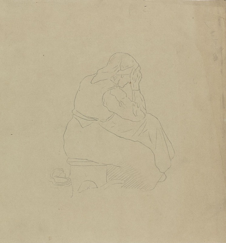 Sittende kvinne med hodet i hendene likely reflects Tidemand's interest in the human condition and emotional introspection. The composition, as suggested by the title, features a seated woman with her head in her hands, a pose that conveys a sense of sorrow, contemplation, or fatigue. This type of imagery aligns with Tidemand's ability to evoke empathy and narrative through his art, often focusing on the quiet, poignant moments of life.