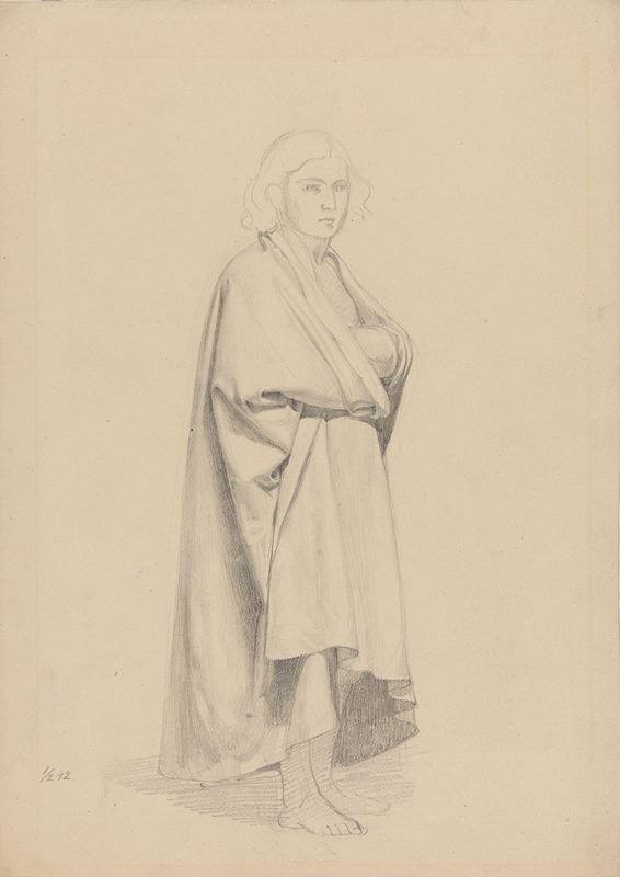 While "Stående ung mann, draperistudie" may not be as widely recognized as some of Tidemand's other works, such as "Haugianerne" or "Brudeferden i Hardanger," it provides insight into his artistic process and the foundational skills that underpinned his more elaborate compositions. The study exemplifies the technical proficiency and attention to detail that Tidemand applied to his art, contributing to his reputation as a leading figure in Norwegian art.