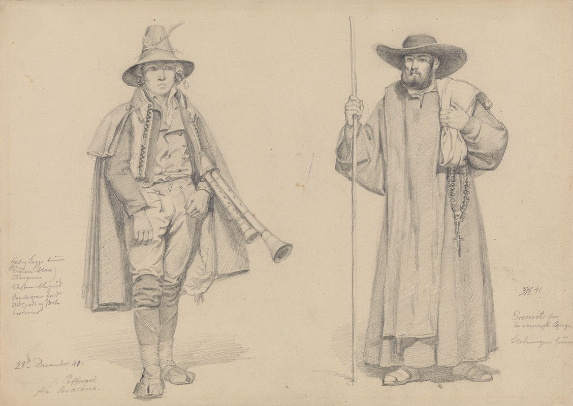 The painting reflects Tidemand's characteristic attention to detail and his ability to capture the essence of his subjects. The zampogna player is depicted in traditional attire, playing his instrument, while the hermit appears contemplative, perhaps listening to the music or lost in thought. The setting is likely a rural or mountainous landscape, consistent with Tidemand's interest in natural and rustic environments.