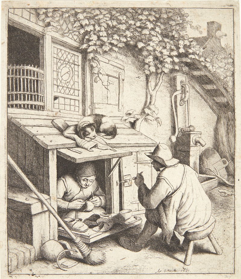 In summary, "The Cobbler" by Adriaen van Ostade is a quintessential example of Dutch genre painting, reflecting the artist's skill in portraying the everyday lives of ordinary people with empathy and precision. Through his detailed and thoughtful depiction of a cobbler at work, van Ostade provides a window into the world of 17th-century Holland, celebrating the dignity of labor and the richness of human experience.
