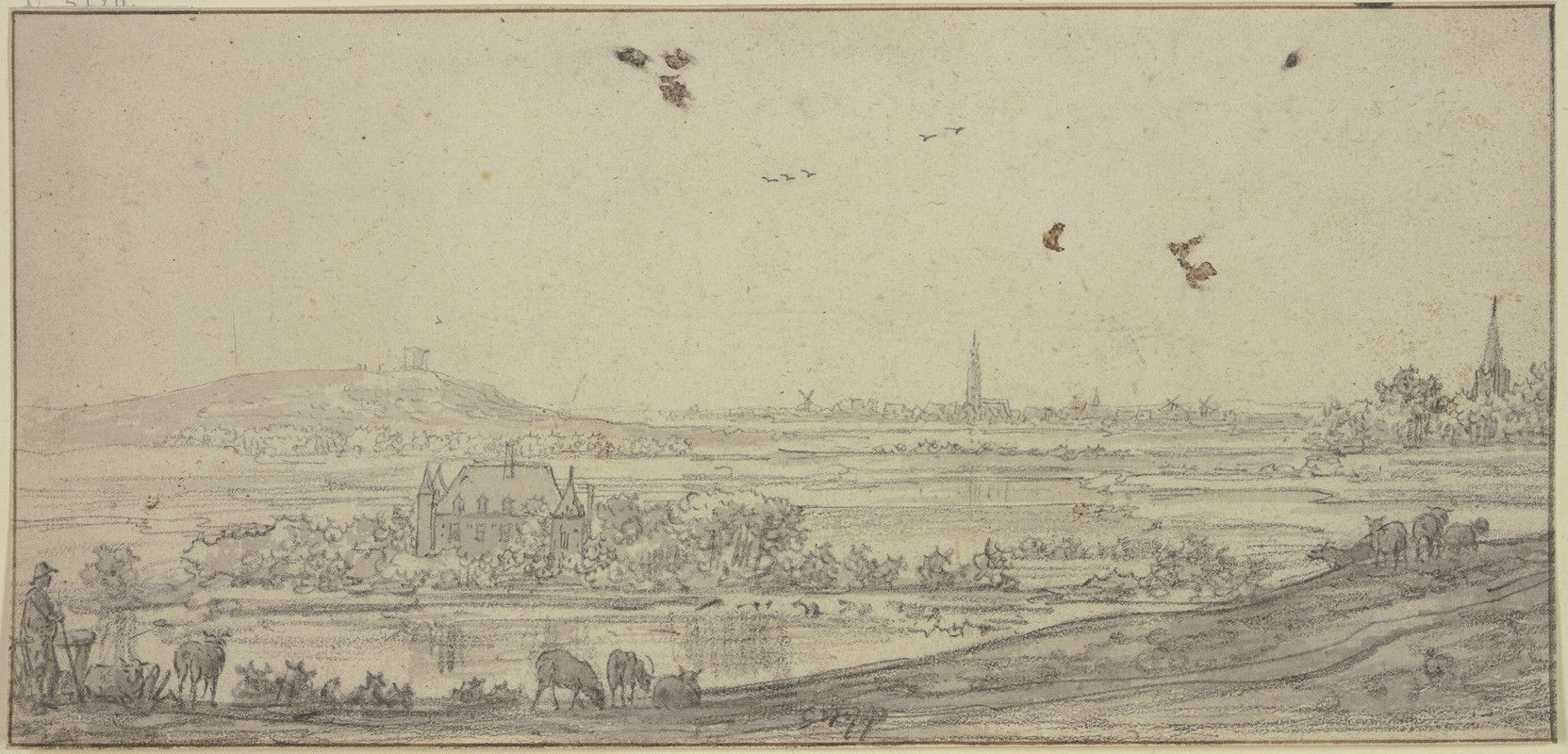 Aelbert Cuyp was a prominent Dutch landscape painter of the 17th century, known for his idyllic and atmospheric depictions of the Dutch countryside. His works are celebrated for their luminous quality and the serene beauty of their compositions. One of his paintings, "In der Ferne eine Stadt, links ein Haus im Wasser, vorne ein Schafhirte," exemplifies these qualities, although specific details about this particular painting are limited.