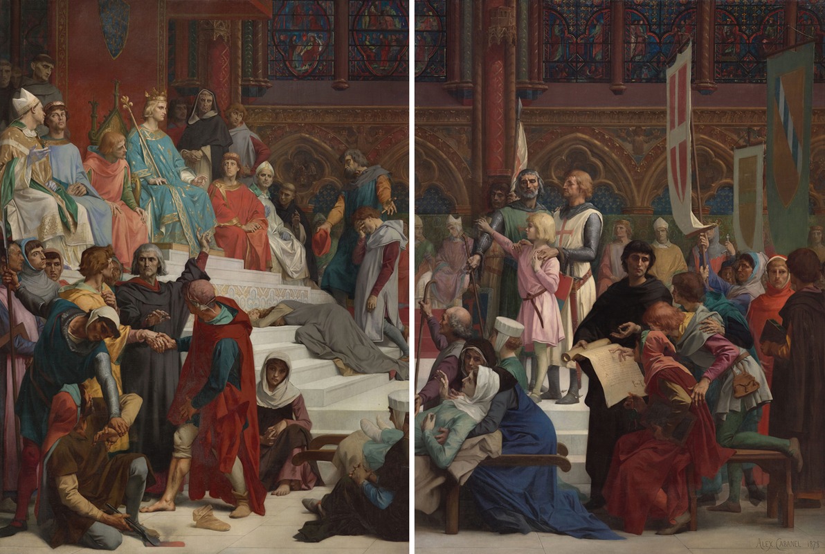 In this artwork, Cabanel illustrates a scene where Saint Louis is administering justice, a theme that highlights the king's reputation as a fair and just ruler. The painting captures the essence of medieval justice, with Saint Louis often portrayed as a wise and benevolent monarch who personally oversaw legal matters. This depiction aligns with historical accounts that describe Louis IX as a king who was deeply involved in the administration of justice, often sitting under an oak tree in Vincennes to hear the grievances of his subjects.
