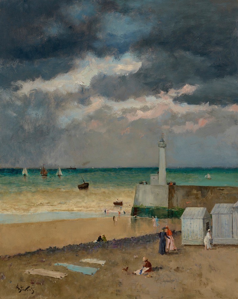 "Le Tréport" is a notable work within Stevens' oeuvre, showcasing his skill in capturing the essence of leisure and the seaside atmosphere. Le Tréport is a coastal town in Normandy, France, known for its picturesque cliffs and vibrant seaside life. During the 19th century, it became a popular destination for the bourgeoisie seeking respite from urban life. Stevens, like many artists of his time, was drawn to such locations, which offered a blend of natural beauty and social activity.