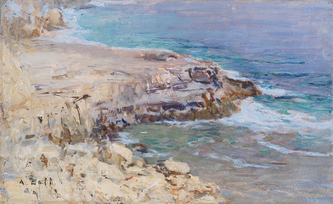 Felsige Küstenpartie portrays a rugged coastal landscape, featuring rocky cliffs and the dynamic interaction between land and sea. The painting reflects Zoff's keen observation of natural elements and his ability to convey the textures and moods of the environment. The use of light and shadow in the artwork highlights the contours of the rocks and the movement of the water, creating a vivid and immersive scene. Zoff's brushwork, characteristic of his Impressionist style, emphasizes the fleeting qualities of light and atmosphere, giving the painting a sense of immediacy and vitality.
