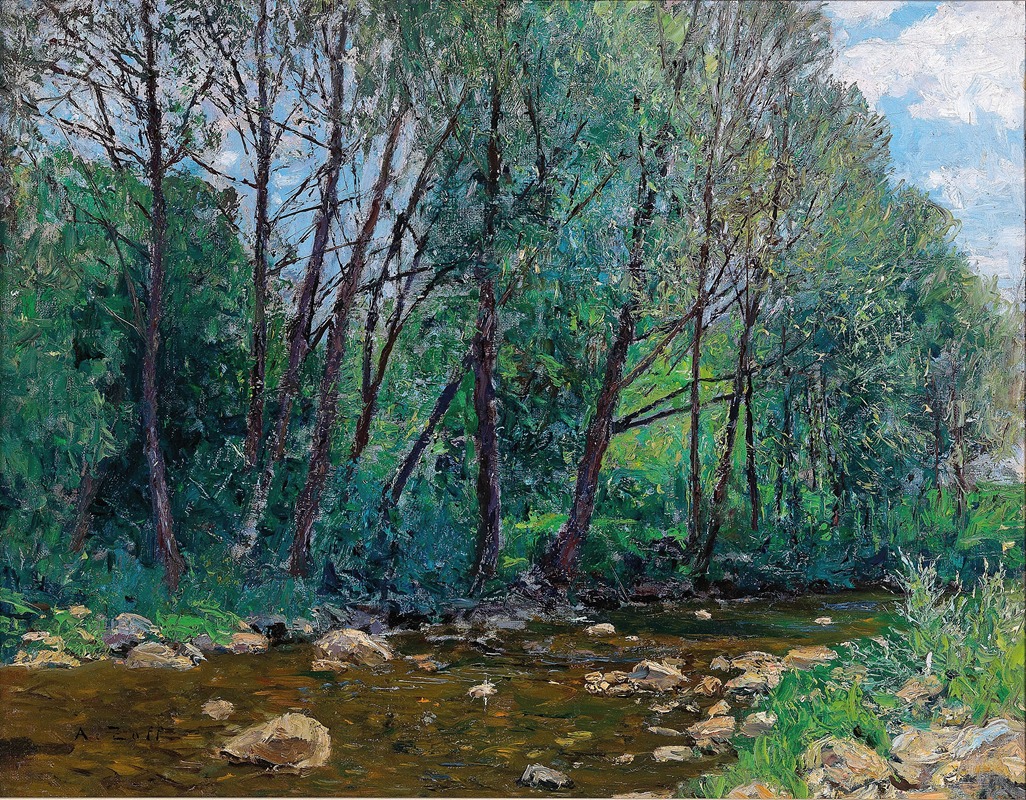 Alfred Zoff was part of the Austrian landscape painting tradition, and his works are often compared to those of his contemporaries, such as Emil Jakob Schindler and Olga Wisinger-Florian. However, Zoff's unique approach to capturing the essence of the natural world sets him apart. His paintings are less about dramatic or grandiose scenes and more about the quiet, often overlooked beauty of everyday landscapes.