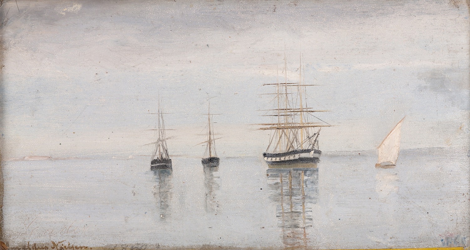 The painting portrays a coastal scene near Cádiz, a city in southern Spain, known for its maritime heritage and picturesque landscapes. In this work, Nielsen captures the unique atmospheric conditions of a rainy day illuminated by sunlight breaking through the clouds. The composition features a harmonious balance of muted tones and vibrant highlights, showcasing Nielsen's skill in rendering the subtleties of natural light. The scene is imbued with a sense of tranquility and realism, characteristic of Nielsen's dedication to plein air painting—a technique he often employed to study and depict nature directly.