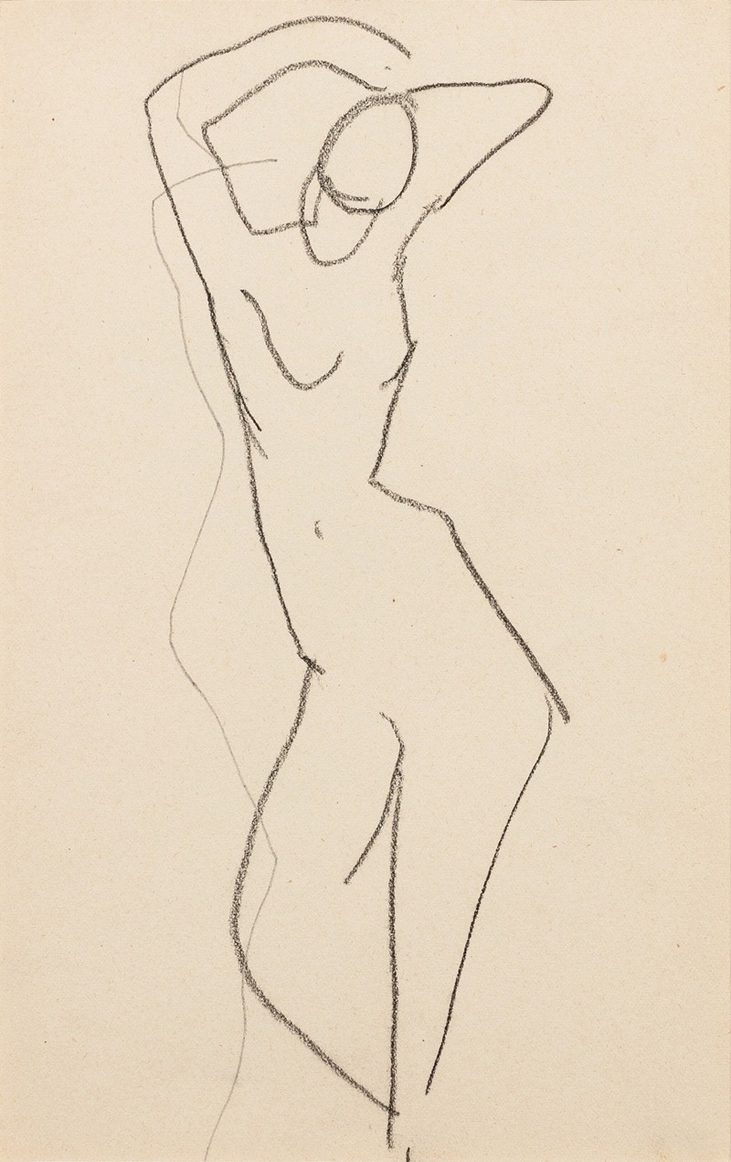 The drawing features a nude woman standing frontally, with her arms raised above her head. This pose is reminiscent of classical sculptures and art, yet Modigliani's interpretation is uniquely modern. The elongated form of the woman, a hallmark of Modigliani's style, is evident in the sketch. The lines are fluid and graceful, capturing the natural curves of the human body while also imparting a sense of movement and vitality.