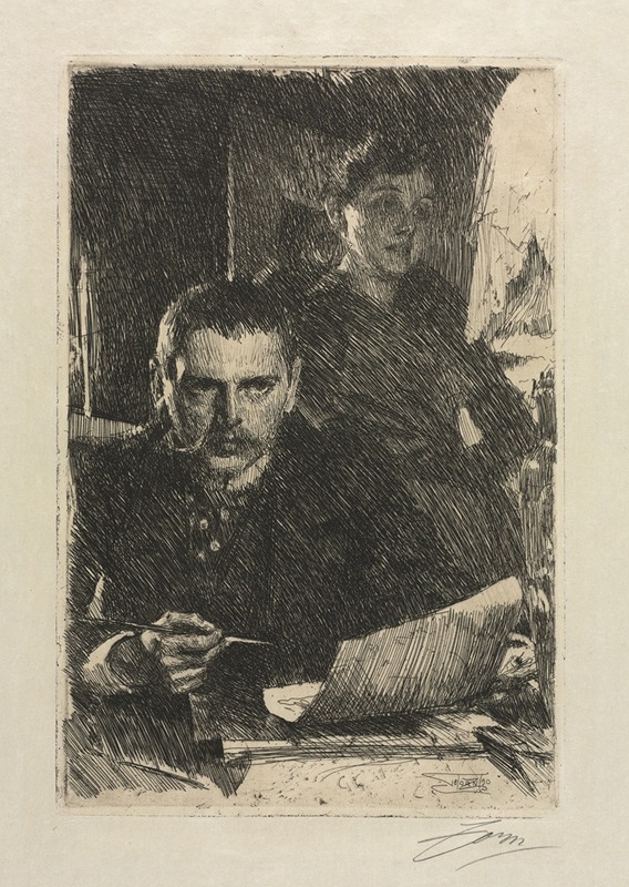 The Artist and His Wife is a painting created by the Swedish artist Anders Zorn in 1896. Zorn, a prominent painter, etcher, and sculptor, is widely regarded as one of Sweden's most celebrated artists. This particular work is an oil painting that depicts Zorn himself alongside his wife, Emma Zorn. The painting is notable for its intimate portrayal of the couple and its demonstration of Zorn's mastery of light, texture, and composition.