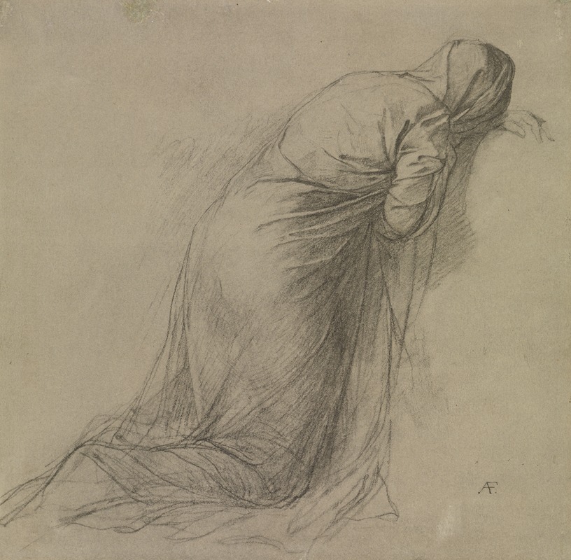 This particular work is a study rather than a finished painting, focusing on the depiction of drapery and the posture of a veiled female figure. The subject is shown kneeling to the right, with her form partially obscured by flowing fabric. The study demonstrates Feuerbach's meticulous attention to the interplay of light and shadow on draped textiles, as well as his ability to convey a sense of movement and grace through the folds of the fabric. Such studies were a common practice for artists of the time, serving as preparatory exercises to refine specific elements for larger, more complex compositions.