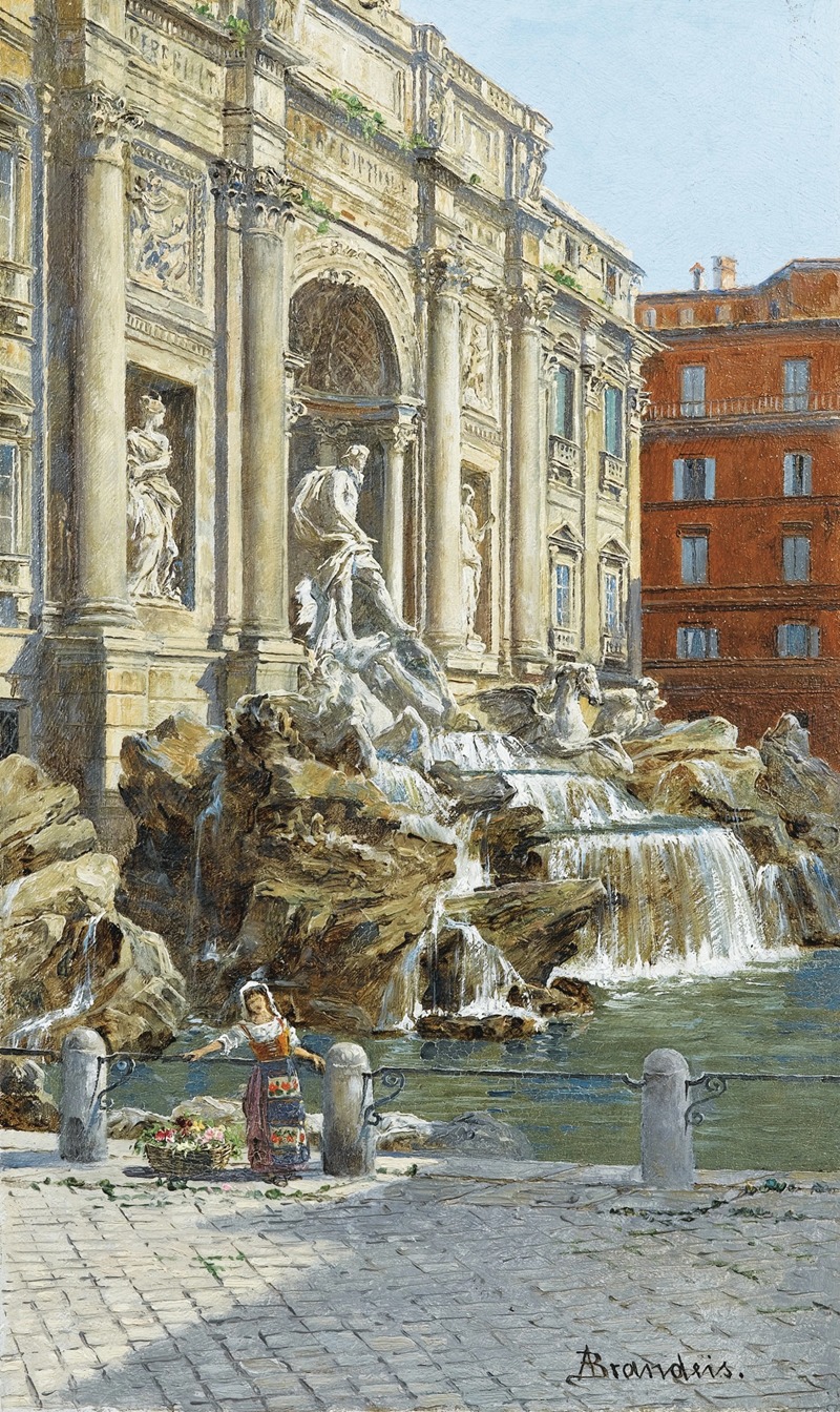 Brandeis's painting of the Trevi Fountain showcases her skill in capturing architectural detail and the play of light and shadow. Her work often reflects a keen observation of the interplay between natural and artificial elements, which is evident in her depiction of the fountain's cascading waters and the surrounding stonework. The painting likely highlights the dynamic movement of water, a key feature of the Trevi Fountain, and the bustling atmosphere of the piazza where it is located.
