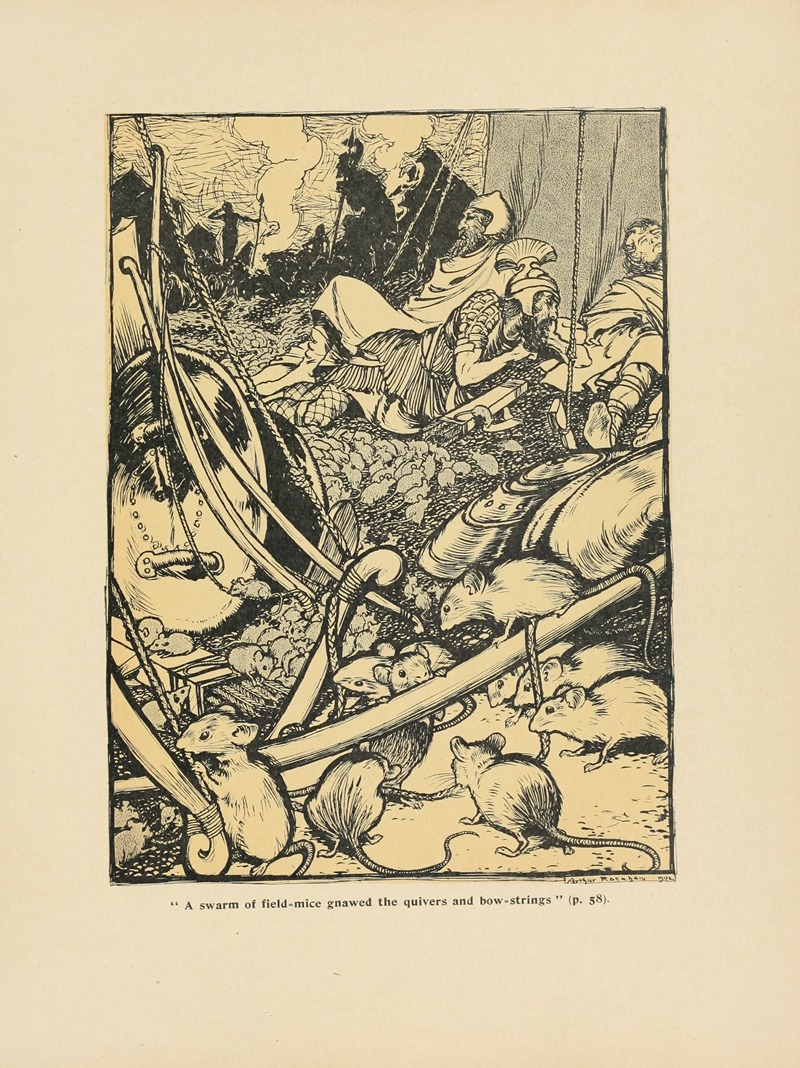 Overall, "A swarm of field-mice gnawed the quivers and bow-strings" is a testament to Rackham's skill as an illustrator and his ability to bring literary scenes to life with his unique artistic vision. His work continues to be celebrated for its contribution to the world of book illustration and its lasting impact on the visual interpretation of classic literature.