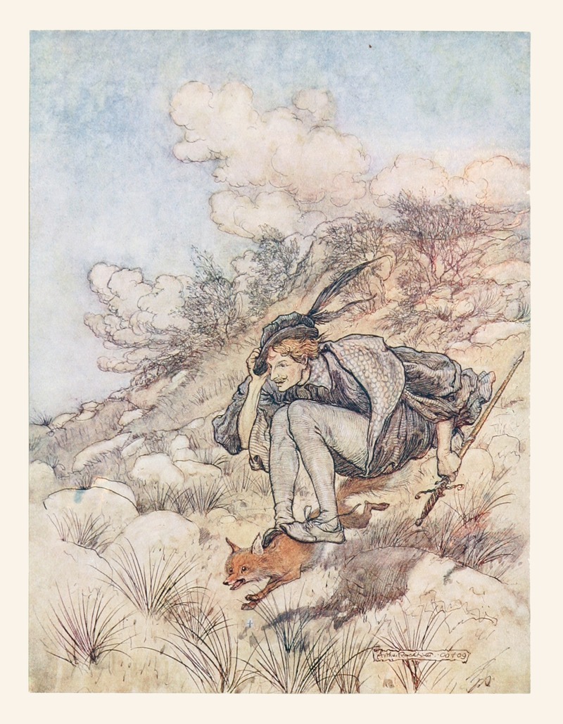 Arthur Rackham (1867–1939) was a renowned English illustrator known for his distinctive style, which combined pen-and-ink drawings with watercolor washes. His works often depicted scenes from fairy tales, myths, and classic literature, and he became one of the most celebrated illustrators of the early 20th century. Among his many illustrations is the piece titled "Away they flew over stock and stone, at such a pace that his hair whistled in the wind."