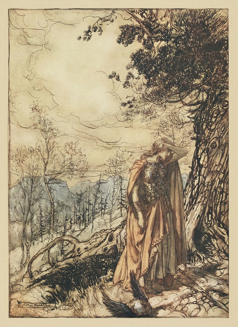 "Brunnhilde stands for a long time dazed and alarmed" is one of Rackham's illustrations for Richard Wagner's epic opera cycle, "Der Ring des Nibelungen" (The Ring of the Nibelung). This particular illustration is part of Rackham's work for the English translation of Wagner's librettos, which were published in the early 20th century. Rackham's illustrations for Wagner's operas are among his most acclaimed works, as they effectively convey the drama and emotion of the operatic narrative.