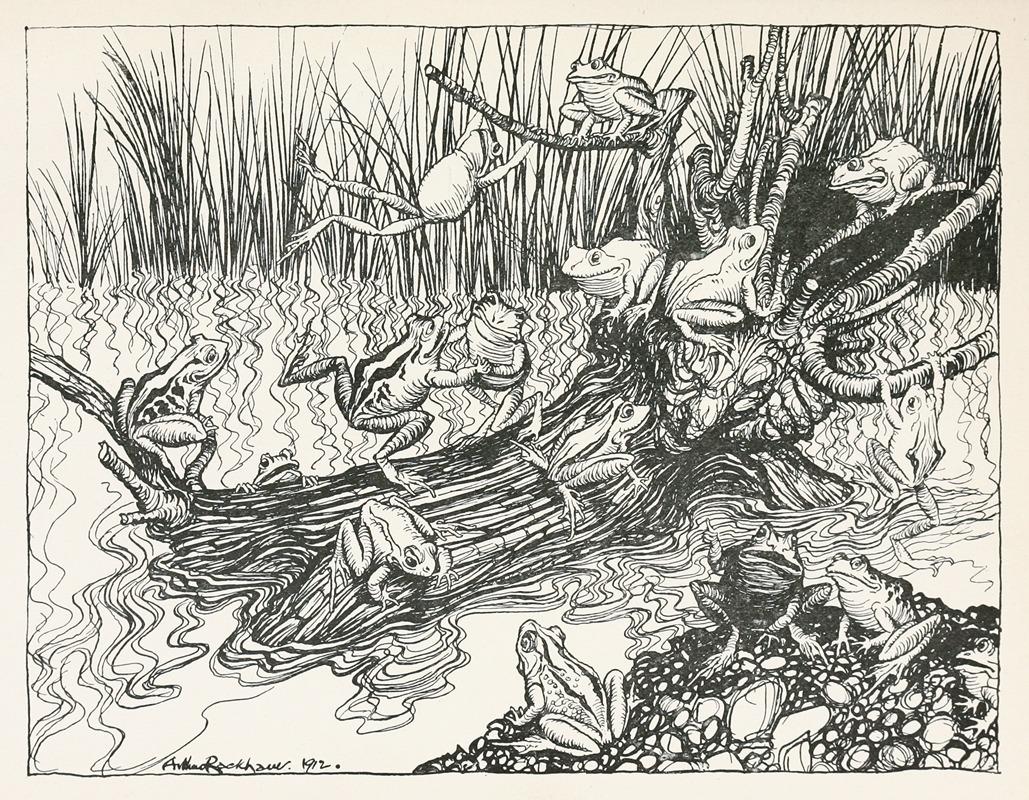 Rackham's illustration of "King Log" captures the humor and irony of the fable. His depiction of the frogs and the log is both whimsical and thought-provoking, reflecting the fable's underlying message. The artwork showcases Rackham's skill in using line and color to create a vivid and engaging scene, drawing viewers into the world of the fable.