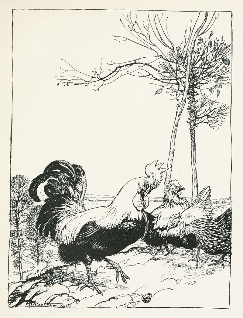 This particular illustration, "The Cock and the Jewel," was created for one of Rackham's many illustrated books. The image depicts a scene from one of Aesop's Fables, a collection of stories attributed to Aesop, a storyteller believed to have lived in ancient Greece between 620 and 564 BCE. The fable tells the story of a cock (rooster) who, while scratching at the ground for food, finds a precious jewel. Despite the jewel's value, the cock dismisses it, preferring something more practical, like a grain of corn.