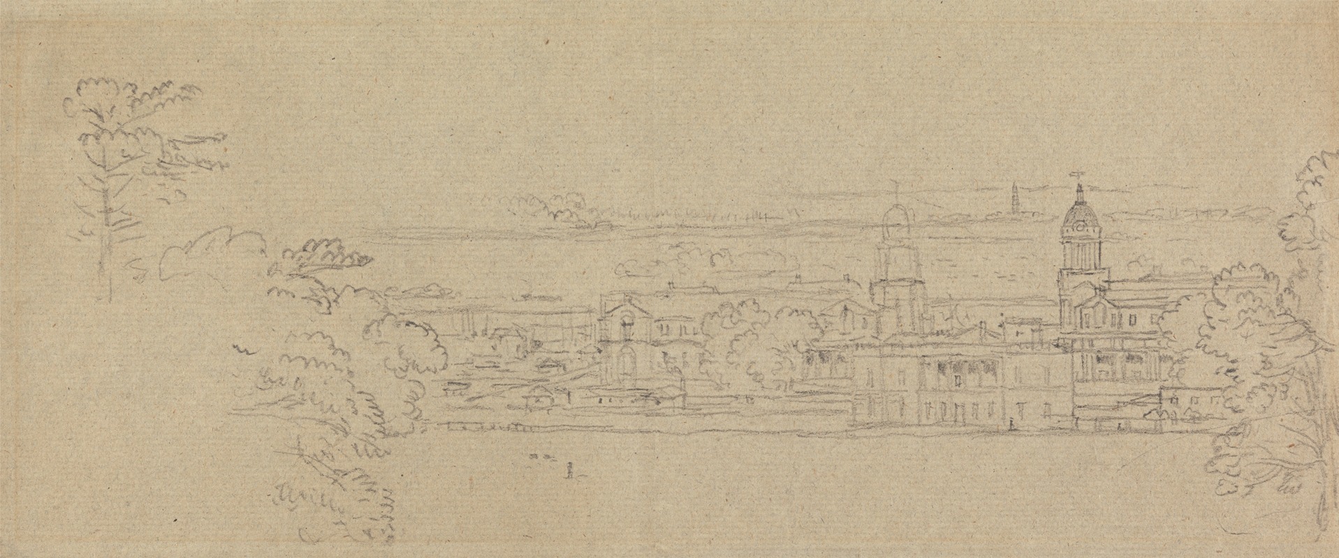 In "Greenwich from the Park," West would have captured the natural beauty and the historical significance of the area, possibly including elements such as the Royal Naval College, which was designed by Sir Christopher Wren and is a notable example of English Baroque architecture. The painting might also reflect the tranquil and picturesque nature of the park itself, with its rolling hills and ancient trees.