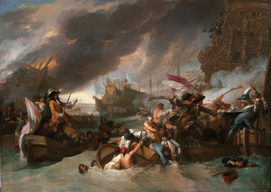 West's painting vividly portrays the chaos and ferocity of the battle. The composition is dynamic, with ships engaged in close combat, cannons firing, and sailors struggling amidst the smoke and flames. The artist's use of light and shadow enhances the dramatic effect, drawing the viewer's eye to the central action while also highlighting individual acts of bravery and desperation.