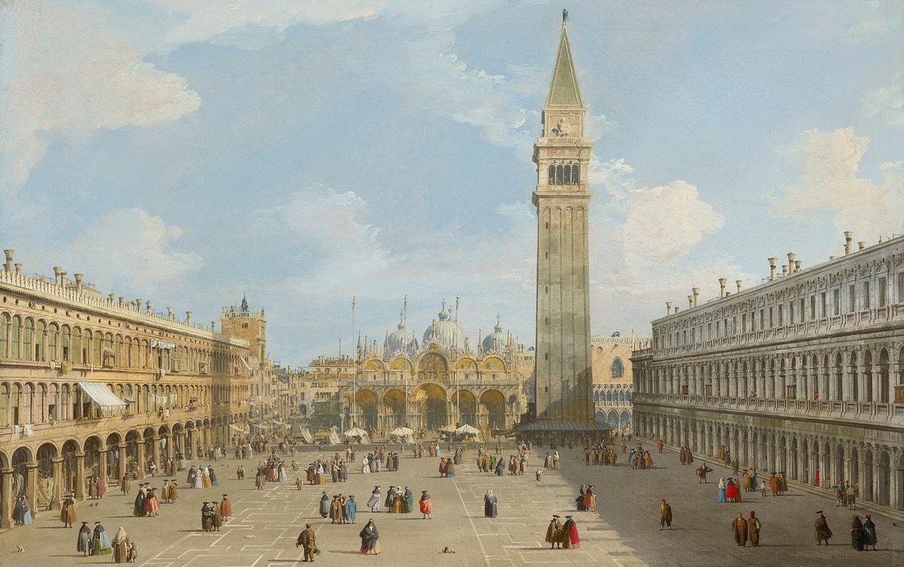 In the foreground, the painting captures the lively atmosphere of the piazza, populated with elegantly dressed figures, vendors, and visitors, reflecting the social and cultural vibrancy of 18th-century Venice. Canaletto's use of light and shadow enhances the sense of depth and realism, while his careful composition guides the viewer's eye through the scene, from the bustling square to the majestic basilica.