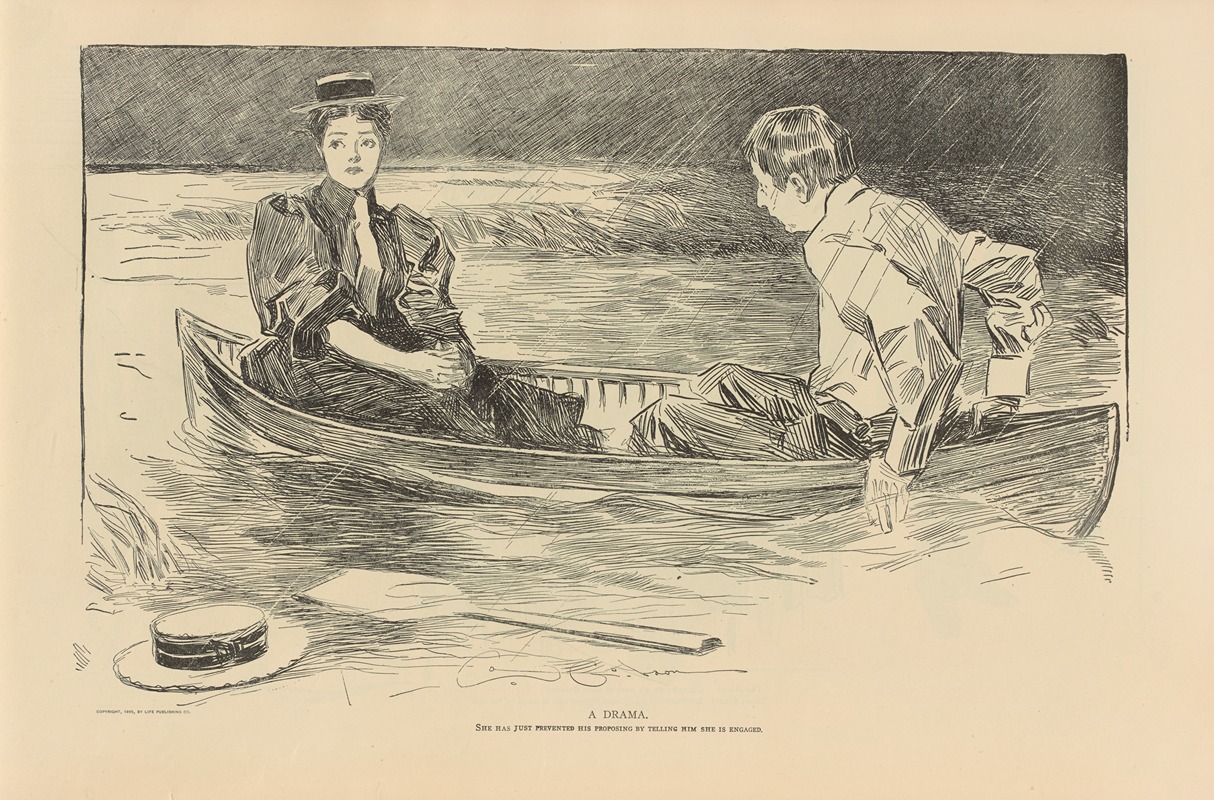 In summary, "A Drama" by Charles Dana Gibson is a quintessential example of his illustrative style and thematic focus. It embodies the elegance, drama, and social commentary that characterize much of his work. Through this illustration, Gibson continues to offer a window into the cultural and social dynamics of his time, making it a valuable piece of art history.