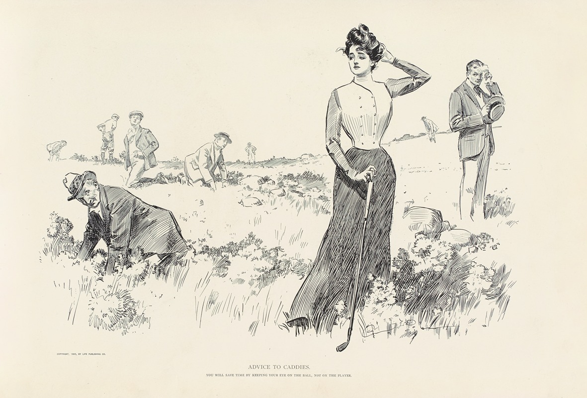 "Advice to Caddies" is an illustration by Charles Dana Gibson, an influential American graphic artist best known for his creation of the "Gibson Girl," a representation of the idealized American woman at the turn of the 20th century. Gibson's work was widely published in magazines such as Life, Harper's Weekly, and Scribner's, making him one of the most prominent illustrators of his time.