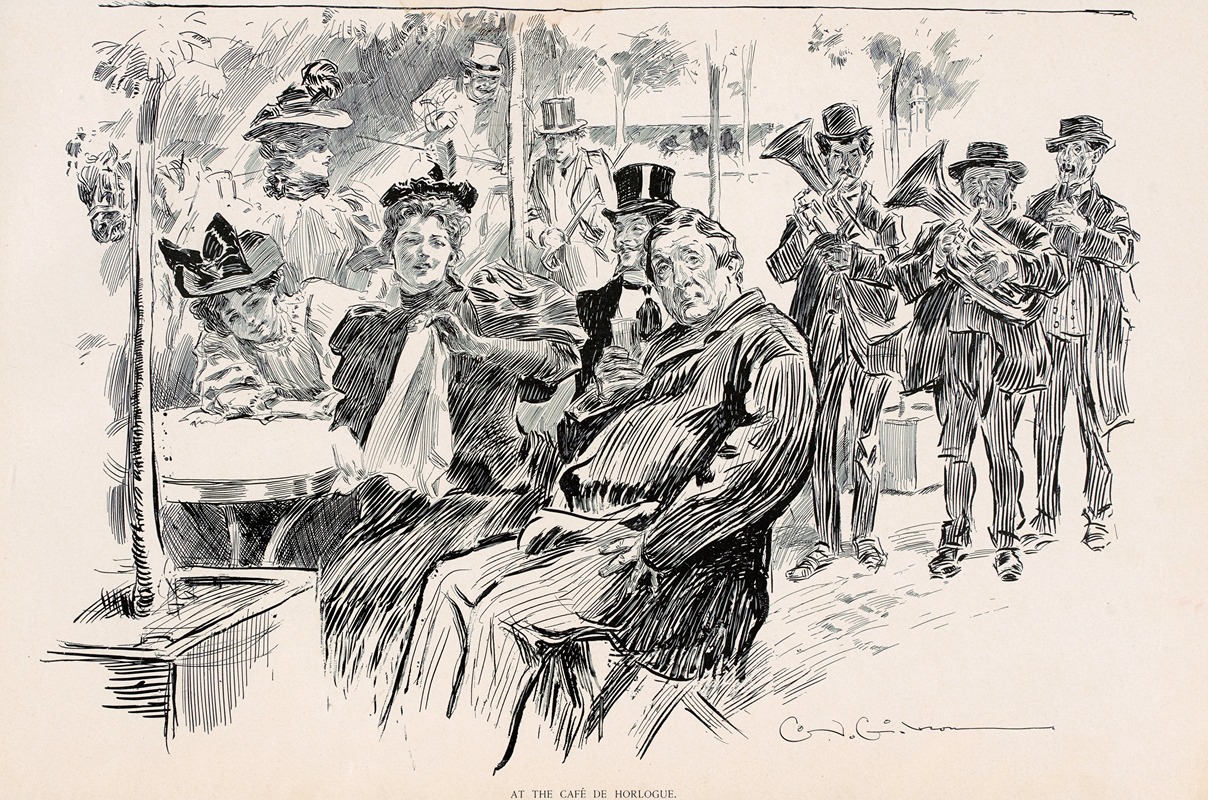 Overall, "At the Cafe de Horlogue" is a testament to Charles Dana Gibson's skill as an illustrator and his ability to capture the nuances of social life during his time. Through his detailed and expressive style, Gibson not only entertained but also provided insight into the cultural shifts of his era.
