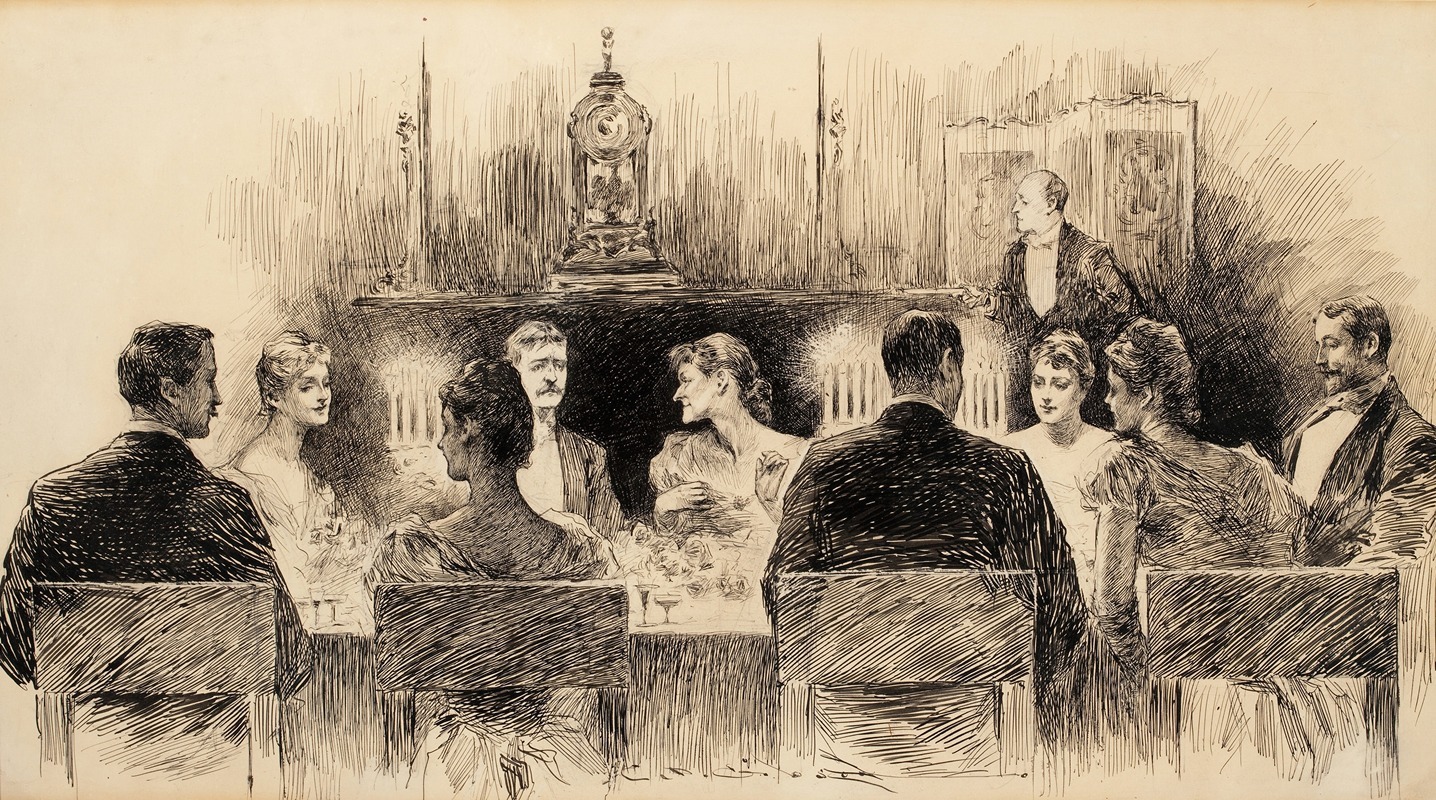 In summary, while there is no specific artwork titled "Dinner Party" by Charles Dana Gibson, his extensive portfolio includes many illustrations of social gatherings that embody the spirit of such an event. His work remains a significant part of American art history, celebrated for its impact on both visual culture and societal norms during the late 19th and early 20th centuries.