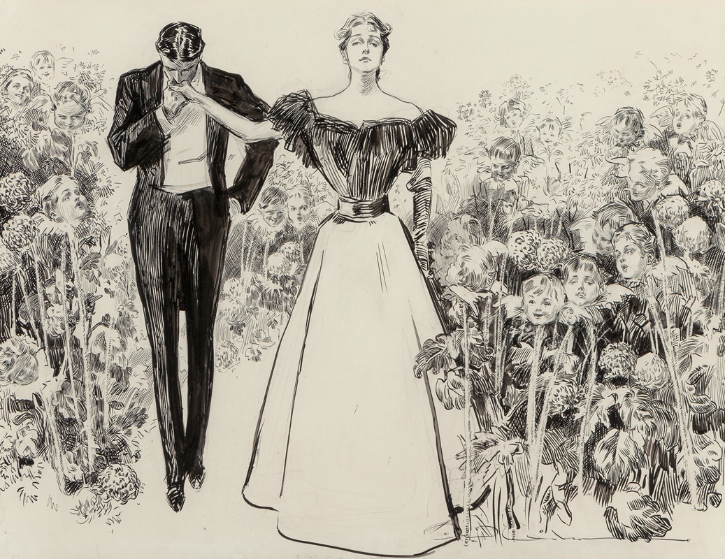 Charles Dana Gibson was an influential American illustrator, best known for his creation of the "Gibson Girl," a representation of the idealized American woman at the turn of the 20th century. His work was widely published in magazines such as Life, Harper's Weekly, and Scribner's, and he played a significant role in shaping the visual culture of his time. One of his notable works is "Garden of Youth," which, like much of Gibson's oeuvre, reflects his keen eye for detail and his ability to capture the social dynamics of his era.
