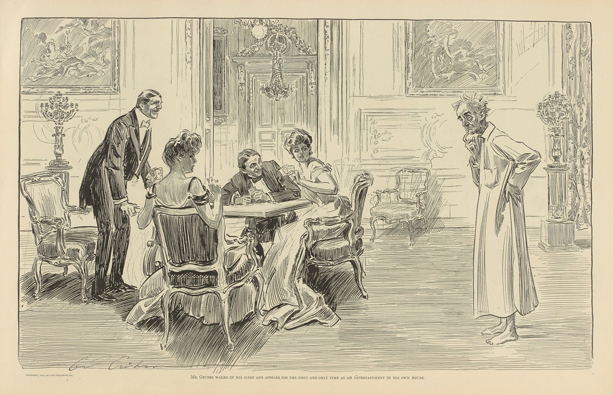 The illustration "Mr. Grubbs Walks in His Sleep" was published in the early 1900s, a period when Gibson's work was widely circulated in popular magazines such as Life, Harper's Weekly, and Scribner's. His illustrations often depicted social scenes and characters with a keen sense of humor and a sharp eye for detail.