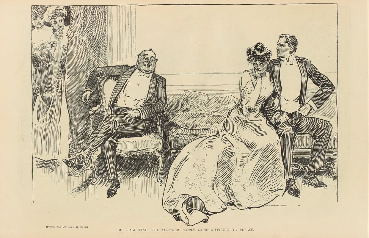 "Mr. Tagg finds the younger people more difficult to please" is one of Gibson's many illustrations that capture the social dynamics and cultural nuances of his era. While specific details about this particular illustration are scarce, it is consistent with Gibson's broader body of work, which often depicted scenes of social interaction, courtship, and the complexities of relationships between men and women.