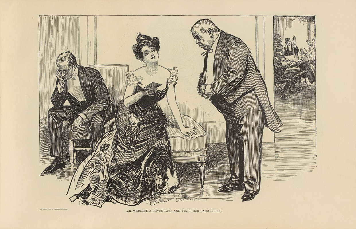 "Mr. Waddles Arrives Late and Finds Her Card Filled" is an illustration created by Charles Dana Gibson, an influential American graphic artist and illustrator, best known for his creation of the "Gibson Girl," a representation of the idealized American woman at the turn of the 20th century. Gibson's work was widely published in magazines such as Life, Harper's Weekly, and Scribner's, and his illustrations played a significant role in shaping the visual culture of his time.