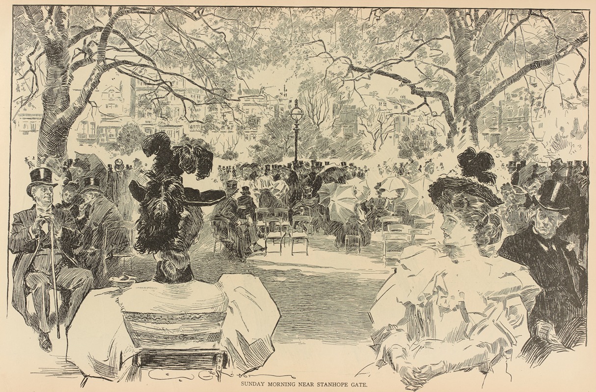 Gibson's illustrations often appeared in popular magazines such as Life and Harper's Weekly, and Sunday Morning Near Stanhope Gate was likely published in one of these outlets. His works were widely celebrated for their wit, elegance, and ability to capture the essence of the Gilded Age and Edwardian society. While Gibson is primarily associated with American culture, this particular piece demonstrates his interest in European settings and customs, reflecting the transatlantic influences of the period.