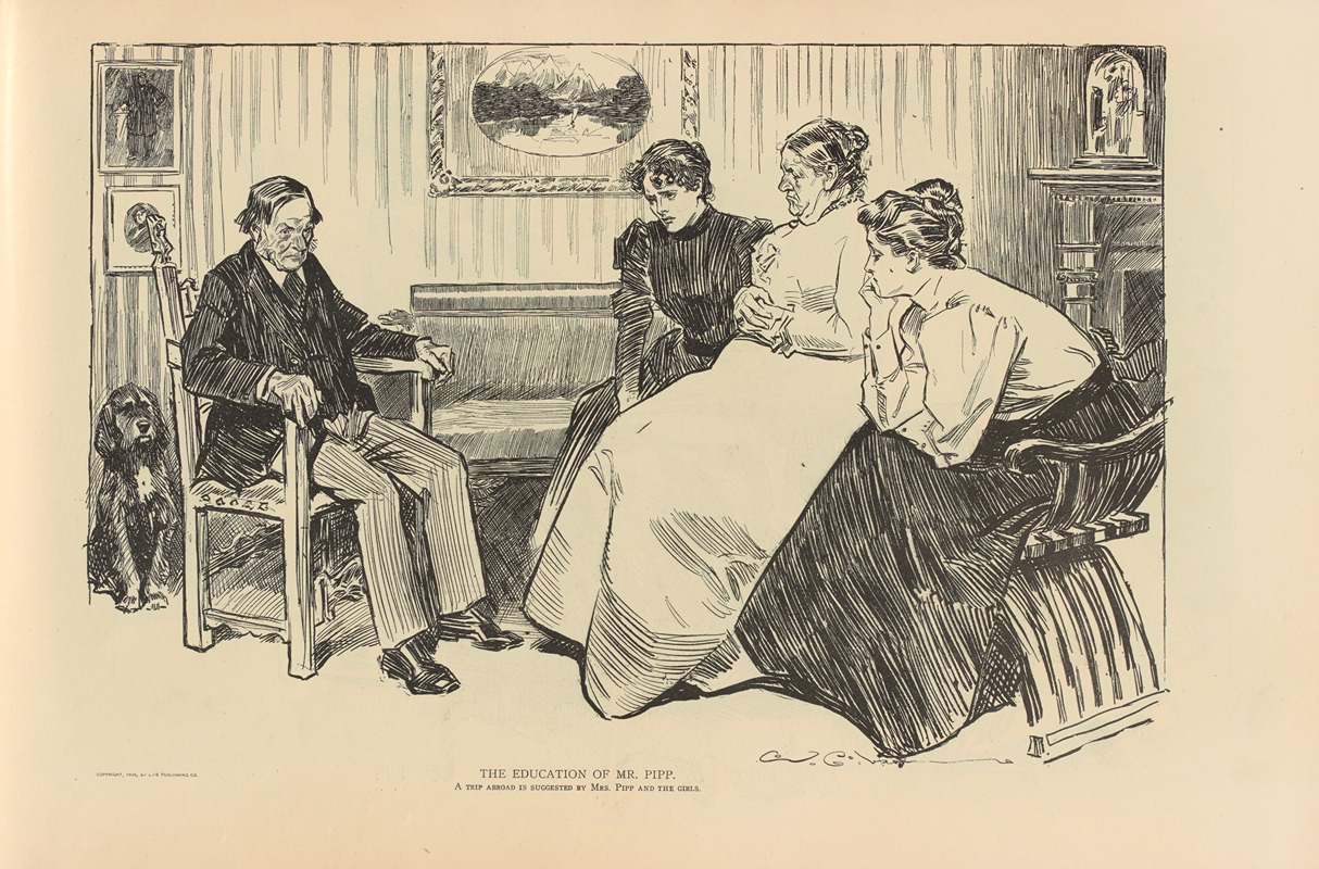 "The Education of Mr. Pipp: A Trip Abroad is Suggested by Mrs. Pipp and the Girls" is an illustration by the renowned American artist Charles Dana Gibson. Gibson, best known for creating the iconic "Gibson Girl," was a prominent illustrator in the late 19th and early 20th centuries. His work was widely published in magazines such as Life, Harper's Weekly, and Scribner's, and he played a significant role in shaping the visual culture of his time.