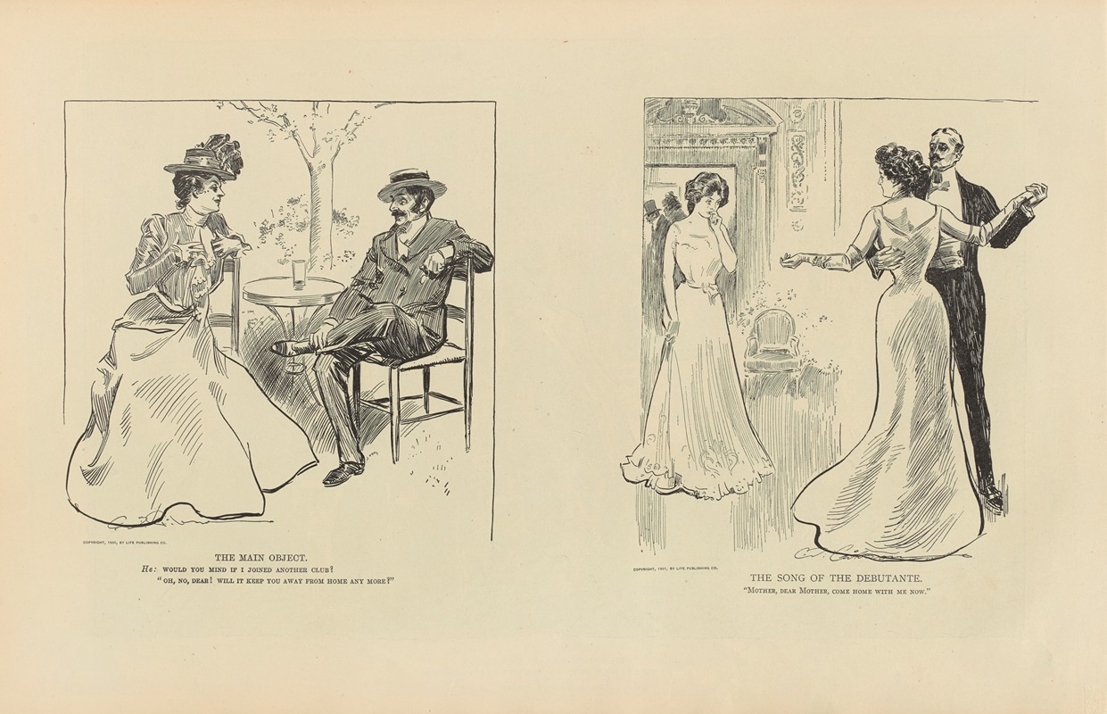 Charles Dana Gibson was an influential American illustrator, best known for his creation of the "Gibson Girl," an iconic representation of the American woman at the turn of the 20th century. His work captured the spirit and style of the era, and his illustrations were widely published in magazines such as Life, Scribner's, and Harper's. Among his many works, "The Main Object; The Song of the Debutante" is one of his notable pieces, though specific details about this particular illustration are less documented compared to some of his other works.