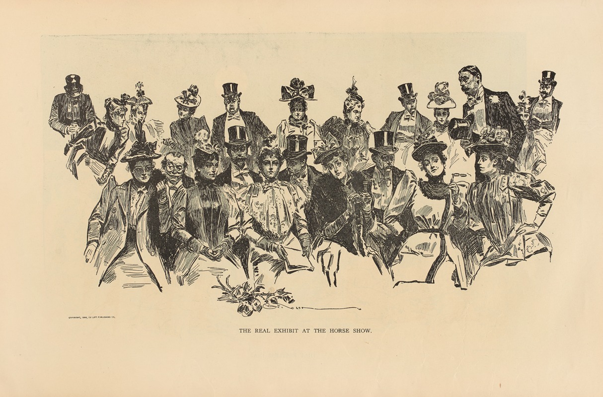 In the illustration, the focus is not on the horses or the competition itself but rather on the spectators, particularly the elegantly dressed women who are the real "exhibit" at the show. This reflects Gibson's commentary on the social dynamics of the time, where the appearance and behavior of the attendees were often as significant as the event itself. The women in the illustration are depicted with the characteristic poise and fashion of the "Gibson Girl," embodying the idealized beauty and sophistication of the era.