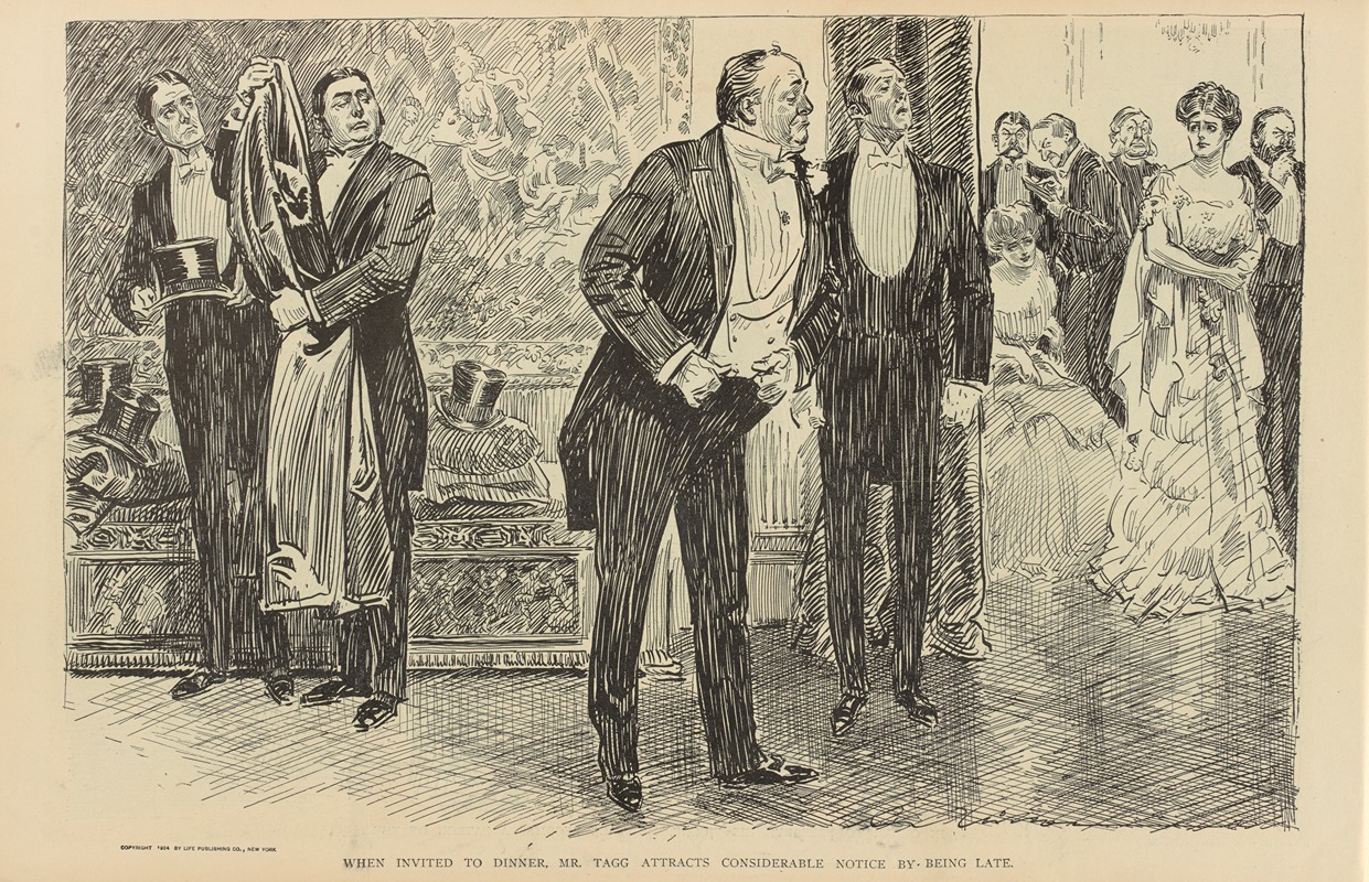 Overall, "When invited to dinner, Mr. Tagg attracts considerable notice by being late" is a testament to Charles Dana Gibson's skill as an illustrator and his ability to capture the essence of his time with wit and precision. His legacy continues to influence artists and illustrators, and his works are still appreciated for their artistic merit and historical significance.