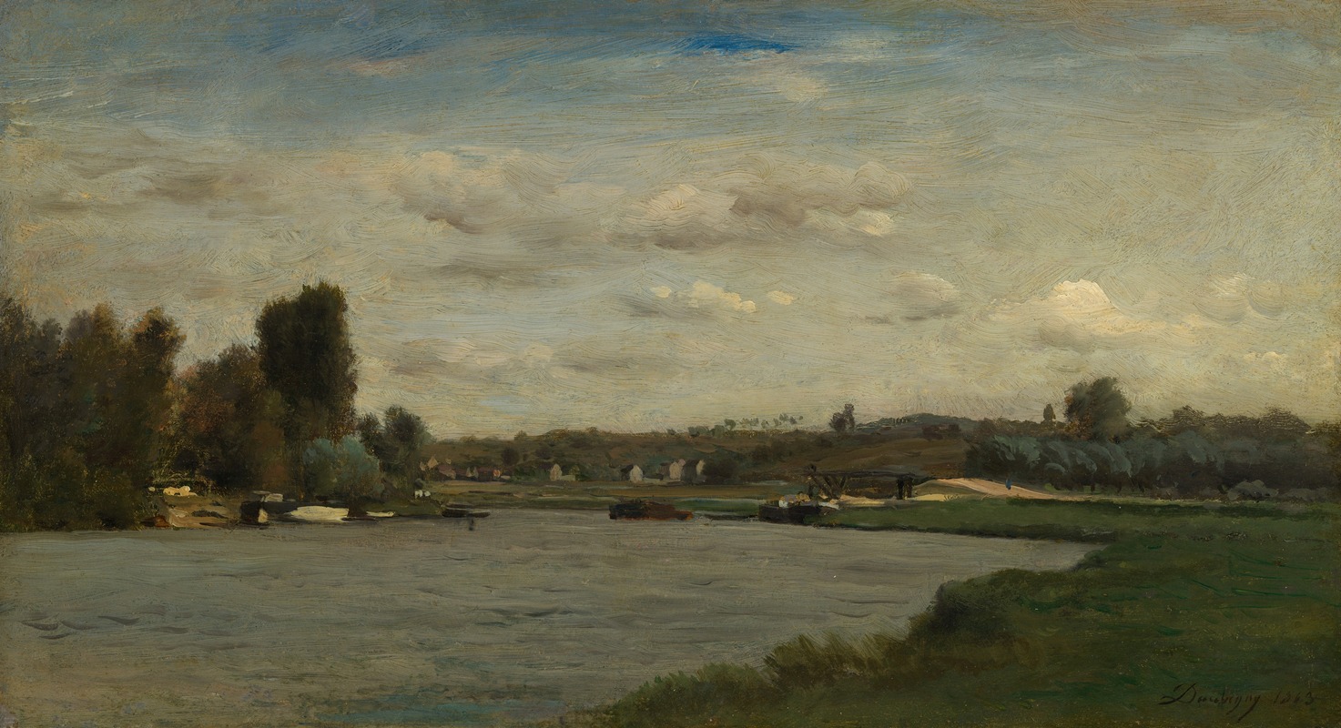 The painting showcases Daubigny's skill in rendering the textures and details of the landscape, from the ripples on the water's surface to the foliage along the riverbank. His brushwork is both precise and expressive, creating a sense of depth and movement within the scene. The overall effect is one of calm and contemplation, inviting the viewer to immerse themselves in the peacefulness of the natural setting.