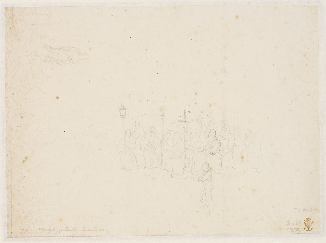 To skitser, en procession af knælende kapucinermunke og en lignende figur, der går op eller ned ad en trappe