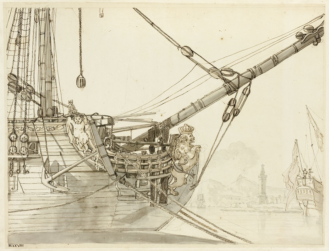 This particular painting, as its title suggests, focuses on the prow of a warship, with additional British warships visible in the background. The setting includes the harbor of Naples, a city that was a significant cultural and maritime hub during Vernet's time. The composition reflects Vernet's meticulous attention to detail in portraying naval architecture and his skill in rendering the dynamic relationship between man-made structures and the natural environment.