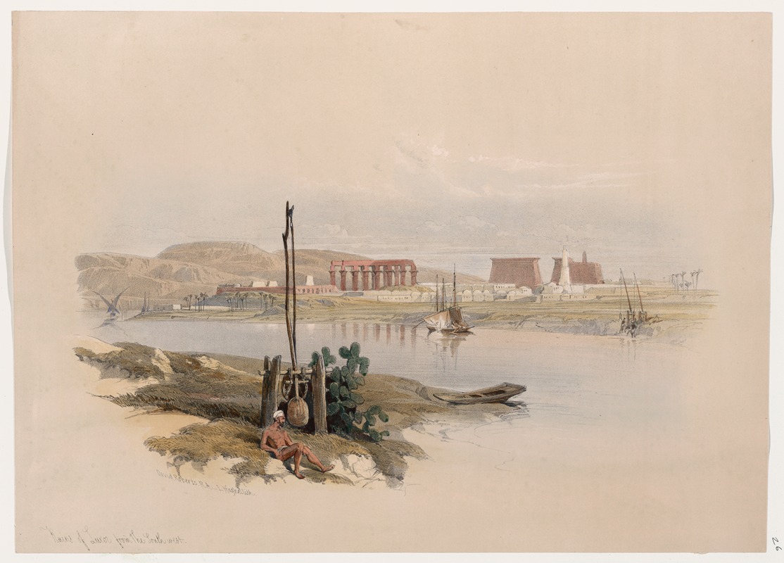 The ruins of Luxor, featured in this painting, are part of the ancient city of Thebes, a UNESCO World Heritage Site. Luxor is home to some of the most significant monuments of ancient Egyptian civilization, including the Luxor Temple and the Karnak Temple complex. The Luxor Temple, which is likely the focus of Roberts' painting, was primarily constructed during the reigns of Pharaohs Amenhotep III and Ramses II, around the 14th and 13th centuries BCE. The temple was dedicated to the Theban Triad of gods: Amun, Mut, and Khonsu.