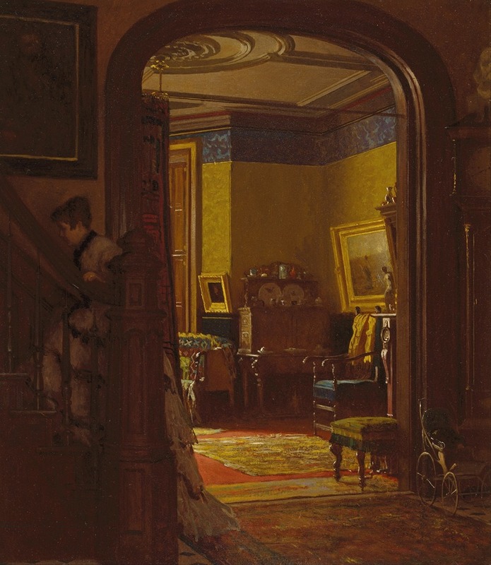 The painting illustrates a moment of absence, as suggested by its title. The scene is set in a well-appointed interior, characterized by its detailed depiction of furniture and decor, which reflects the middle to upper-class American home of the period. Johnson's use of color and composition draws the viewer's eye around the room, inviting them to piece together the story behind the scene. The absence of figures in the painting suggests a narrative of waiting or anticipation, a theme that resonates with viewers and invites personal interpretation.