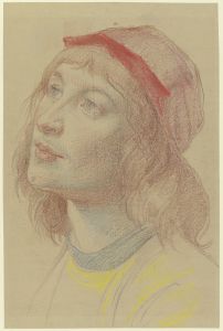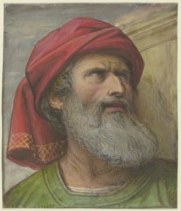 Kopf eines aufwärts blickenden Mannes mit Turban