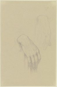 Die schön geformte rechte Hand eines Mannes, auf der Lehne eines Stuhls ruhend; daneben die Skizze einer derberen Hand