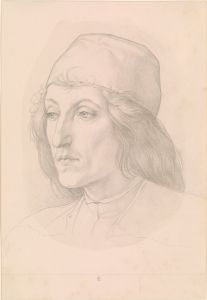 Christ with his favorite disciple John, half-length figures at the table of the Last Supper, above them the Trinity