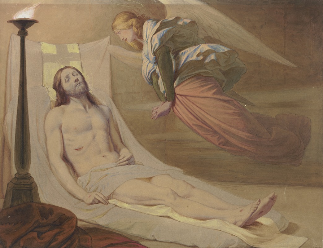 The composition of the painting is carefully balanced, with the angel positioned centrally above Christ's body. This central placement draws the viewer's eye to the angel's sorrowful expression and the delicate way in which it hovers, almost as if suspended in a moment of eternal grief. The folds of the angel's robes and the detailed rendering of Christ's body demonstrate Steinle's skill in capturing both the physical and emotional aspects of the scene.