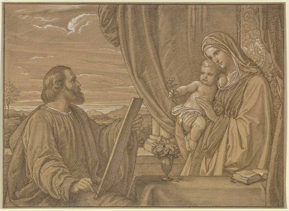 "Der Heilige Lukas in der Gestalt des Künstlers Karl Kappes, die Madonna malend" is a painting by Eduard von Steinle, a prominent 19th-century German painter associated with the Nazarene movement. The painting depicts Saint Luke, the patron saint of artists, in the guise of the artist Karl Kappes, painting the Madonna. This work reflects the Nazarene movement's emphasis on religious themes and the revival of medieval and early Renaissance artistic styles.