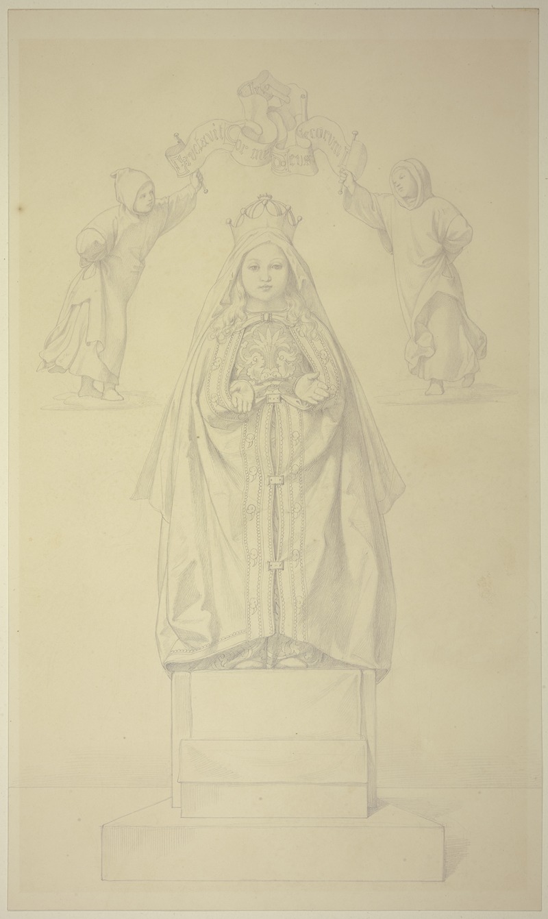 In summary, "Die kleine Maria in eine Dalmatica gehüllt, über ihr zwei Engel mit Spruchband" is a fine example of Eduard von Steinle's work, reflecting his dedication to religious themes and his mastery of the Nazarene style. Through this painting, Steinle invites viewers to contemplate the divine mysteries and the role of Mary within the Christian tradition.