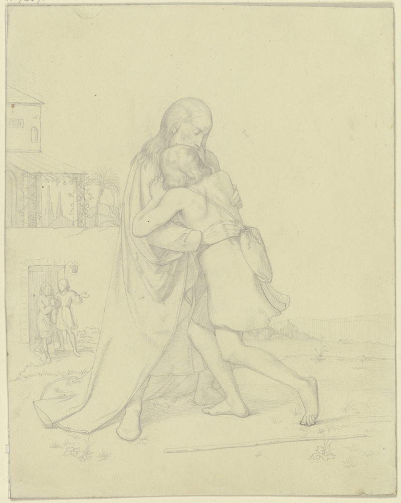 Eduard von Steinle was a prominent 19th-century German painter associated with the Nazarene movement, which sought to revive honesty and spirituality in Christian art. One of his notable works is "Rückkehr des verlorenen Sohnes" (The Return of the Prodigal Son), which illustrates the biblical parable of the prodigal son from the Gospel of Luke in the New Testament.